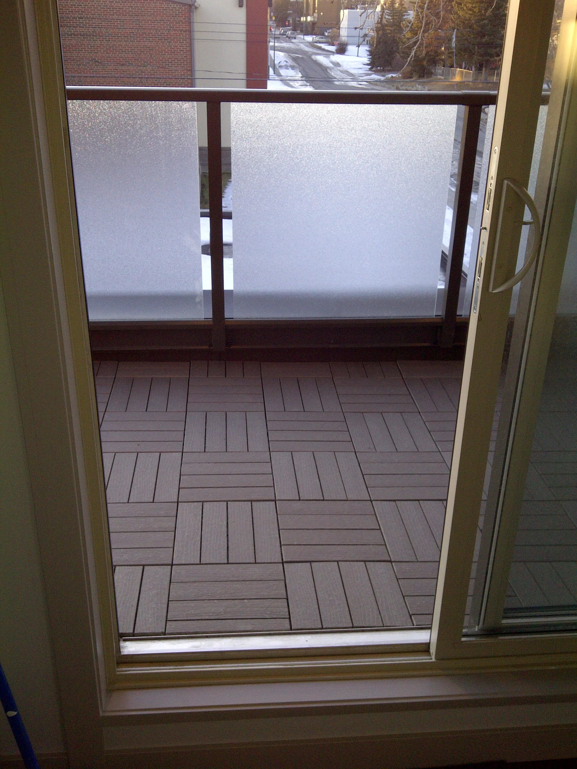 Enter MoistureShield! This manufacturer can supply their EcoShield Deck Tiles at about the same price-point as installed tile or hardwood flooring. Easy to install over almost any flat surface (including asphalt roofing or vinyl decking), these 12 X 12” tiles snap together to create your choice of three attractive grid patterns that are offered in four basic colors, great for any exterior renovation project. Made with 90% recycled content, these non-toxic EcoShield tiles require no maintenance and are structured to allow moisture to flow-through to existing balcony and roof drains. They can also be cut to fit an odd shaped space or around obstacles.